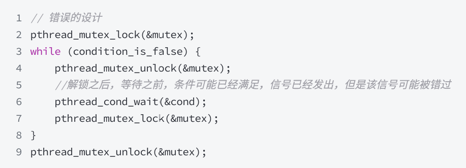 • 条件的满足必然涉及共享数据变更,因此必须通过互斥锁保护。缺乏互斥锁将无法安全地访问和修改共享数据。
