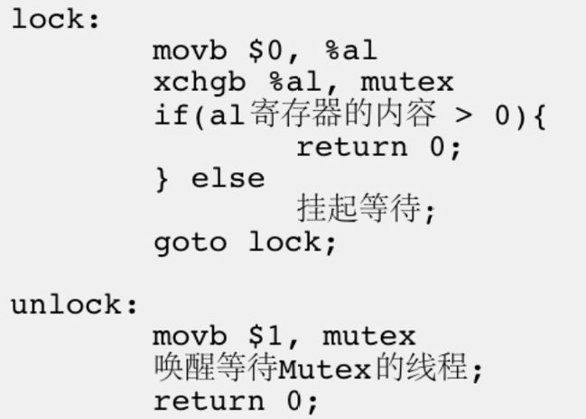 • 为实现互斥锁操作,多数体系结构提供了swap或exchange指令。该指令用于交换寄存器与内存单元的数据,由于是单条指令,能够保证原子性。即便在多处理器平台上,内存访问存在先后顺序,当某个处理器执行交换指令时,其他处理器的交换指令必须等待总线周期完成。现对lock和unlock的伪代码进行调整如下: