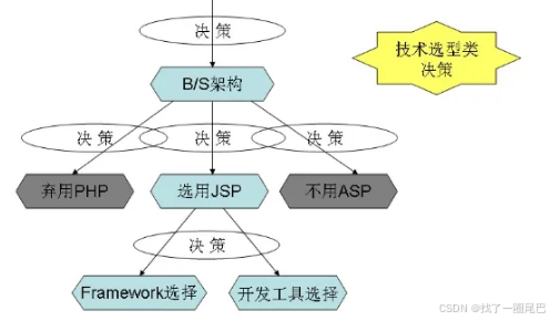 中层决策:基于 B/S 架构,做编程语言层面的选型决策(如 "弃用 PHP""选用 JSP""不用 ASP")