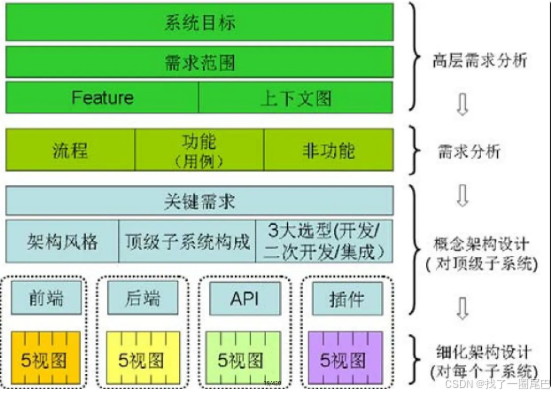 整个过程是从 "宏观需求" 到 "具体架构" 的逐层细化链路,每阶段任务都为下阶段提供明确输入,保障需求与架构的精准匹配。