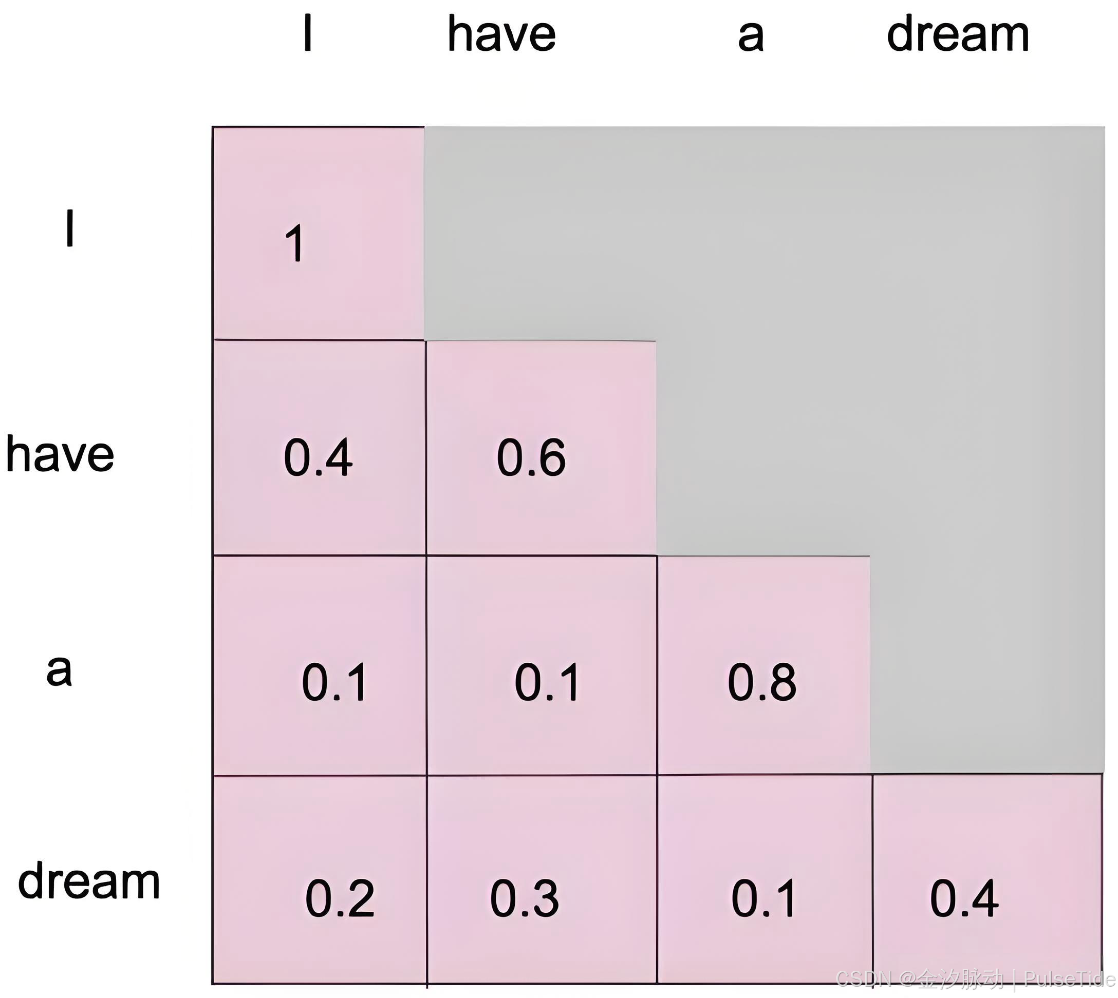 - Value (V,值向量):代表当前词的实际内容信息。可以理解为"我的具体内容是什么?"。