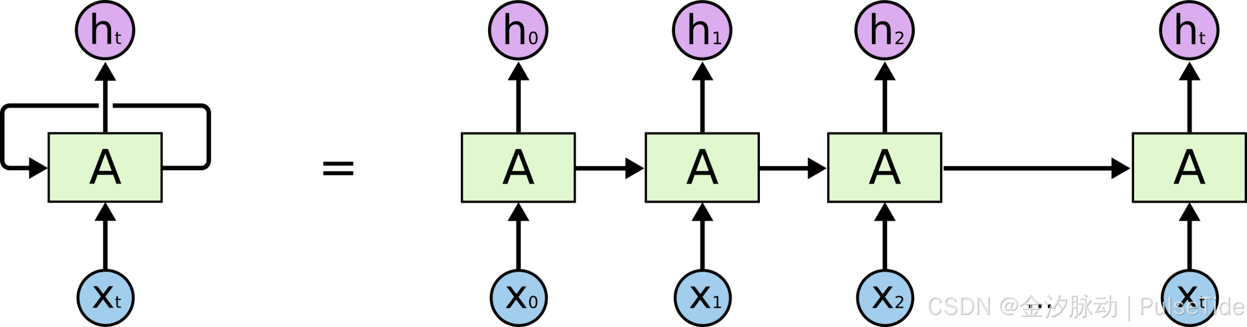(图1: RNN结构。同一个神经网络单元在时间上被重复使用,隐藏状态h在时间步之间传递信息。)