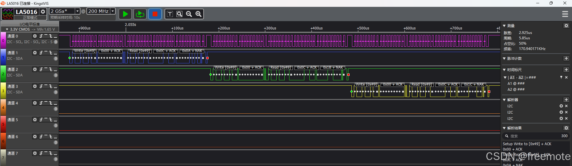 验证了共用1个SCL、3个不同的SDA线,即主机轮训访问设备的情况,可以看出,方案是可行的。