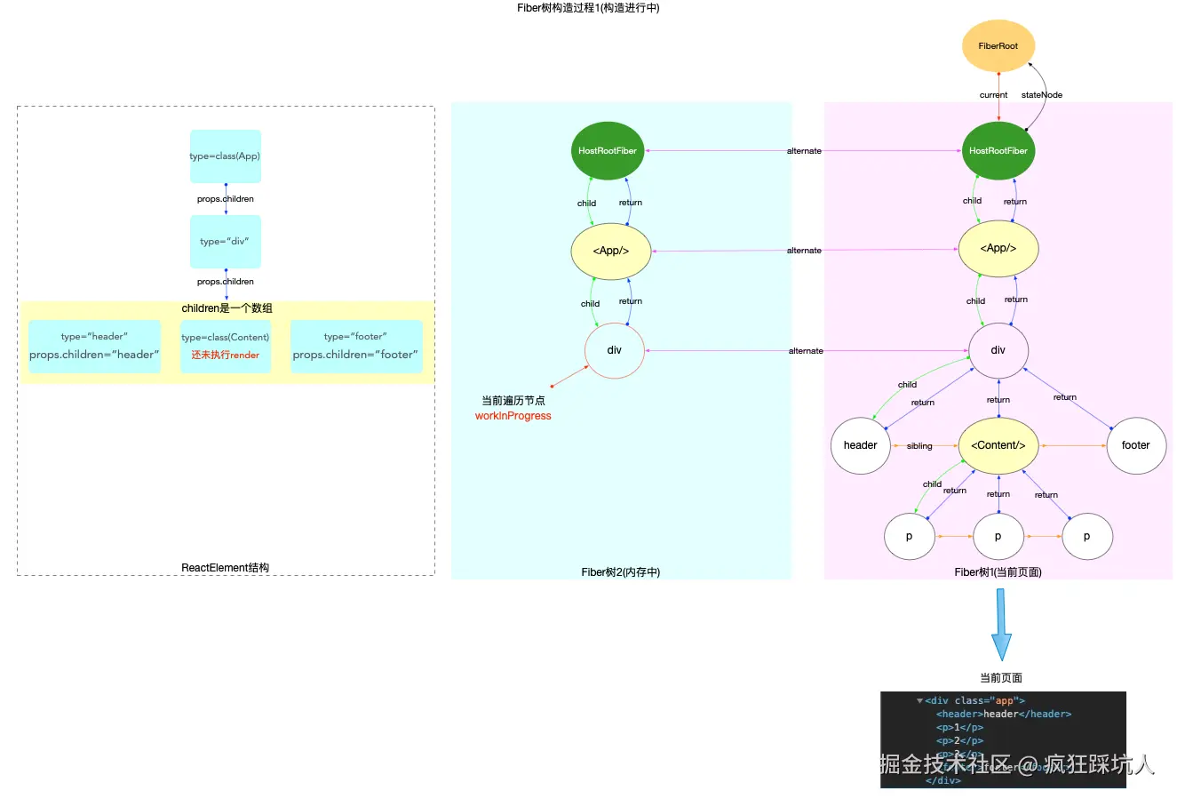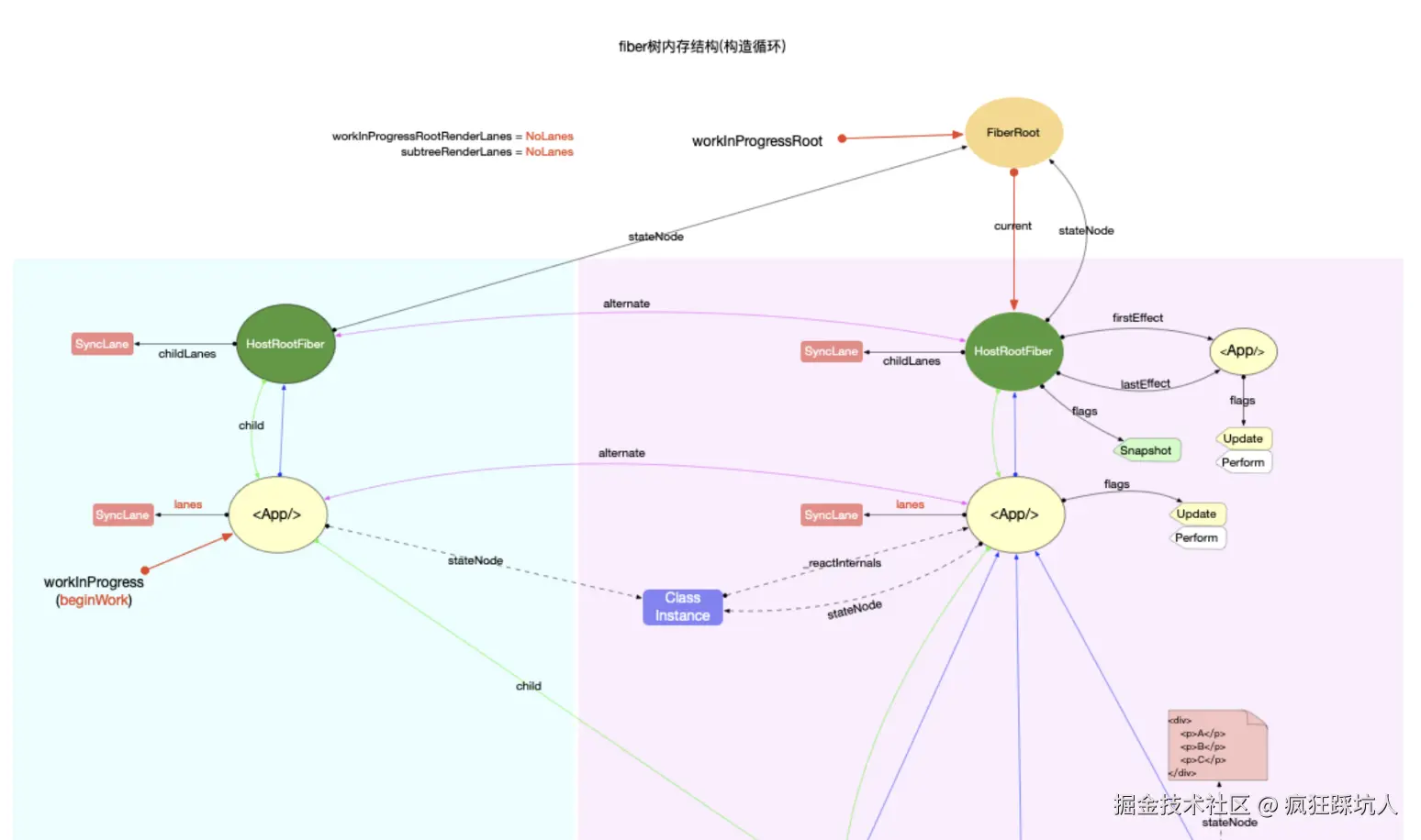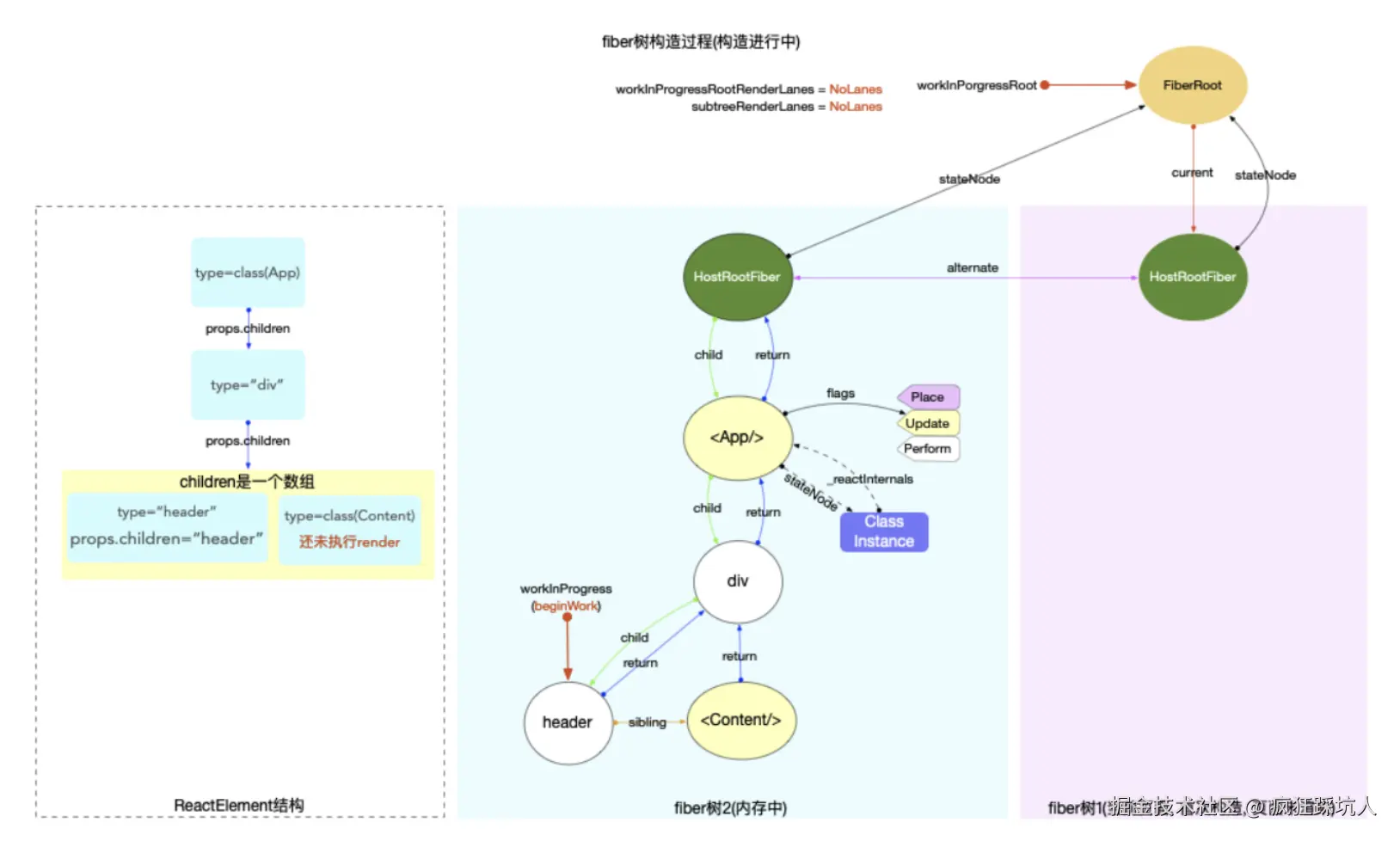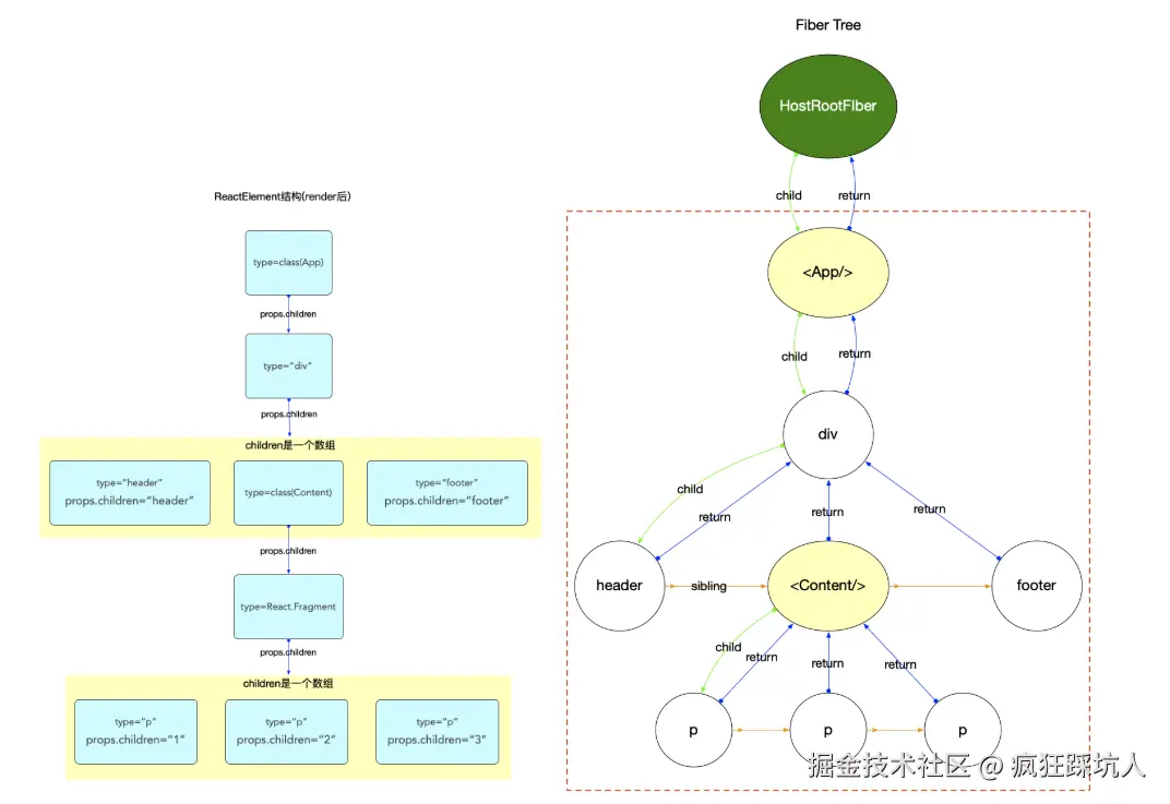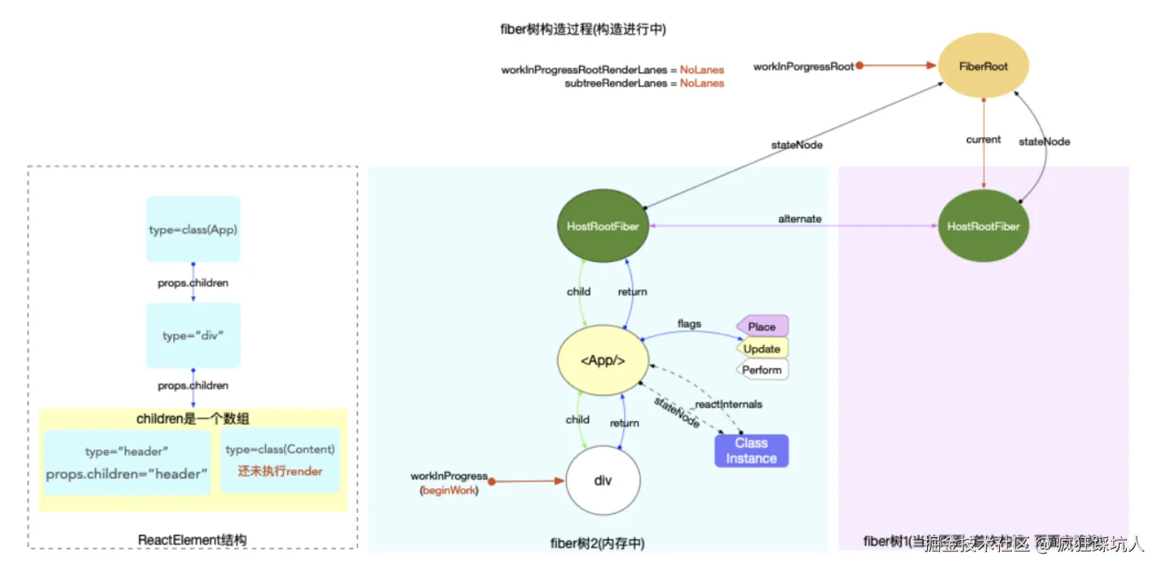- 一定程度上你可以认为ReactElement是虚拟DOM, 也可以认为FiberNode是虚拟DOM。FiberNode是在ReactElement基础上进一步封装,补充描述了状态、dom、副作用标记、节点关系等等。