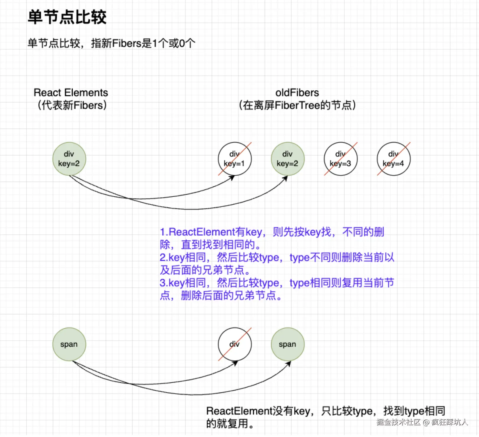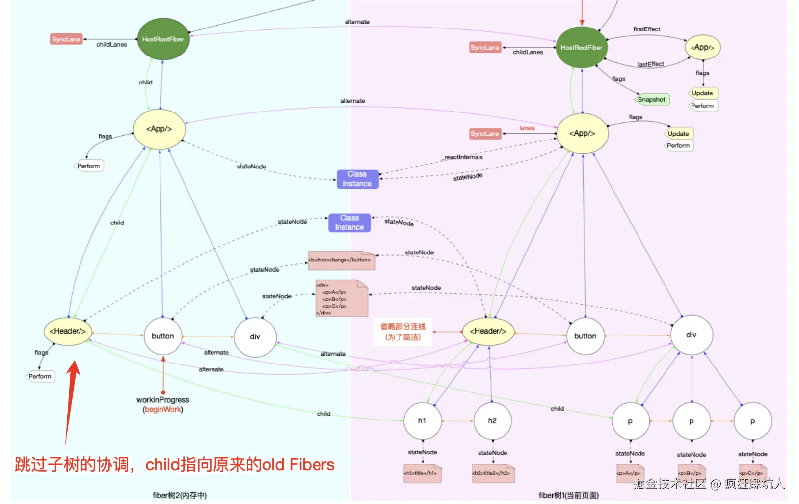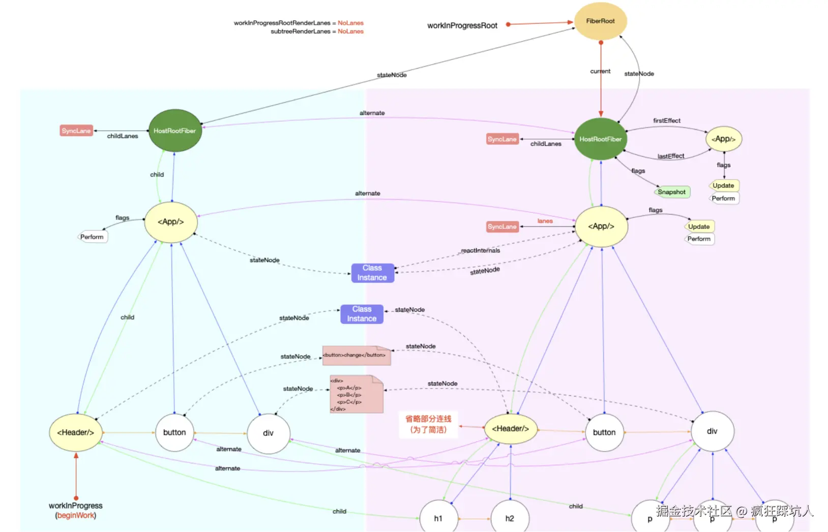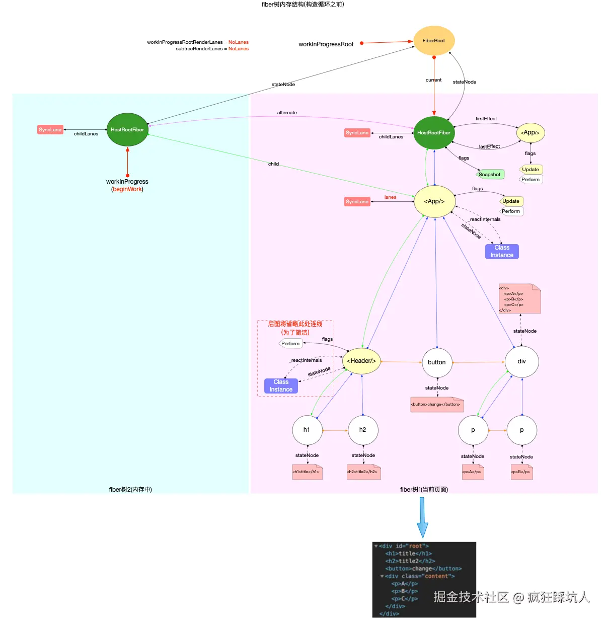 - 一定程度上你可以认为ReactElement是虚拟DOM, 也可以认为FiberNode是虚拟DOM。FiberNode是在ReactElement基础上进一步封装,补充描述了状态、dom、副作用标记、节点关系等等。