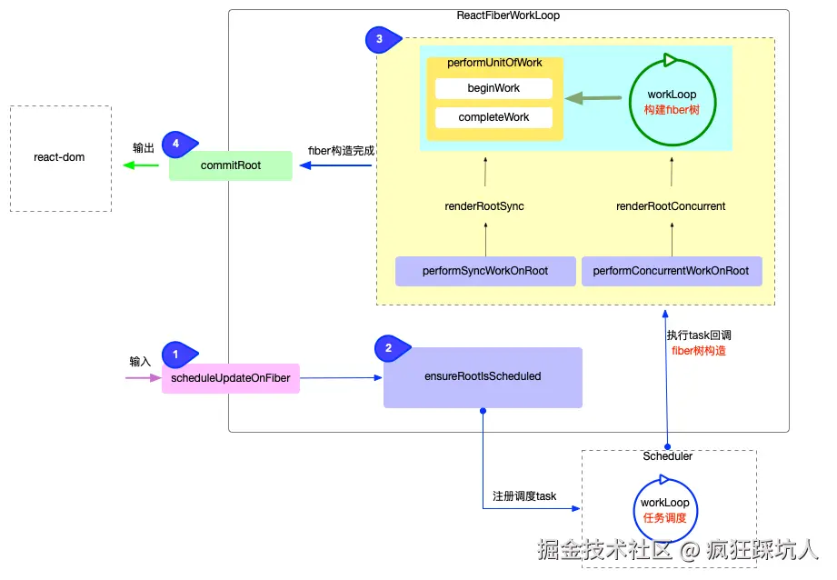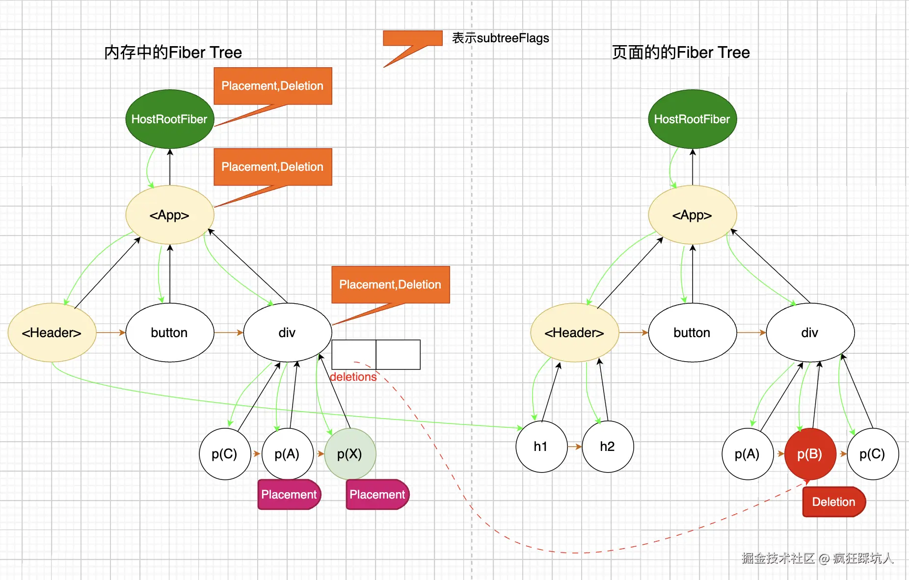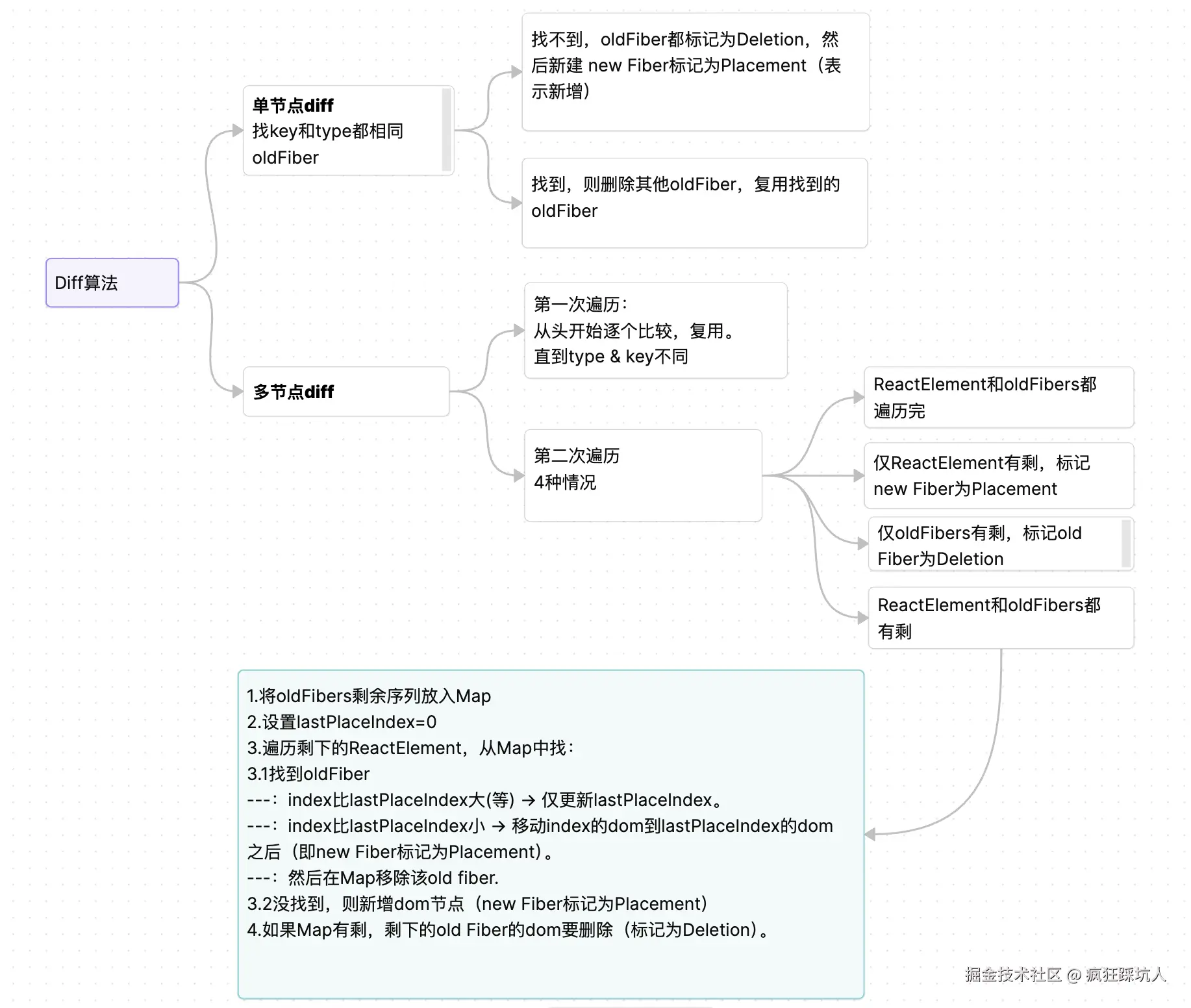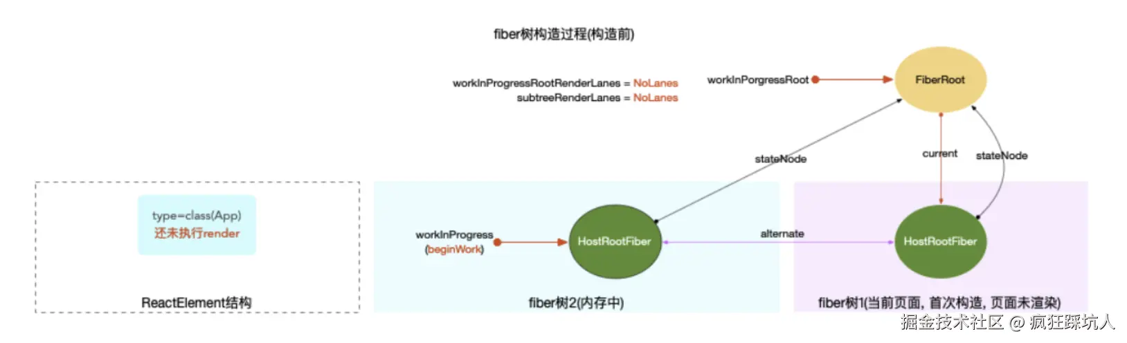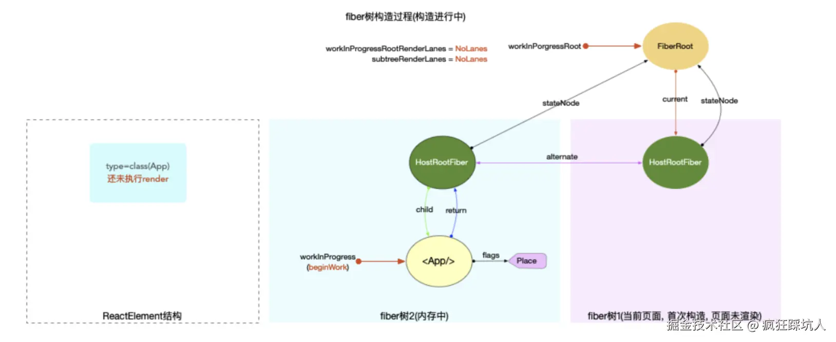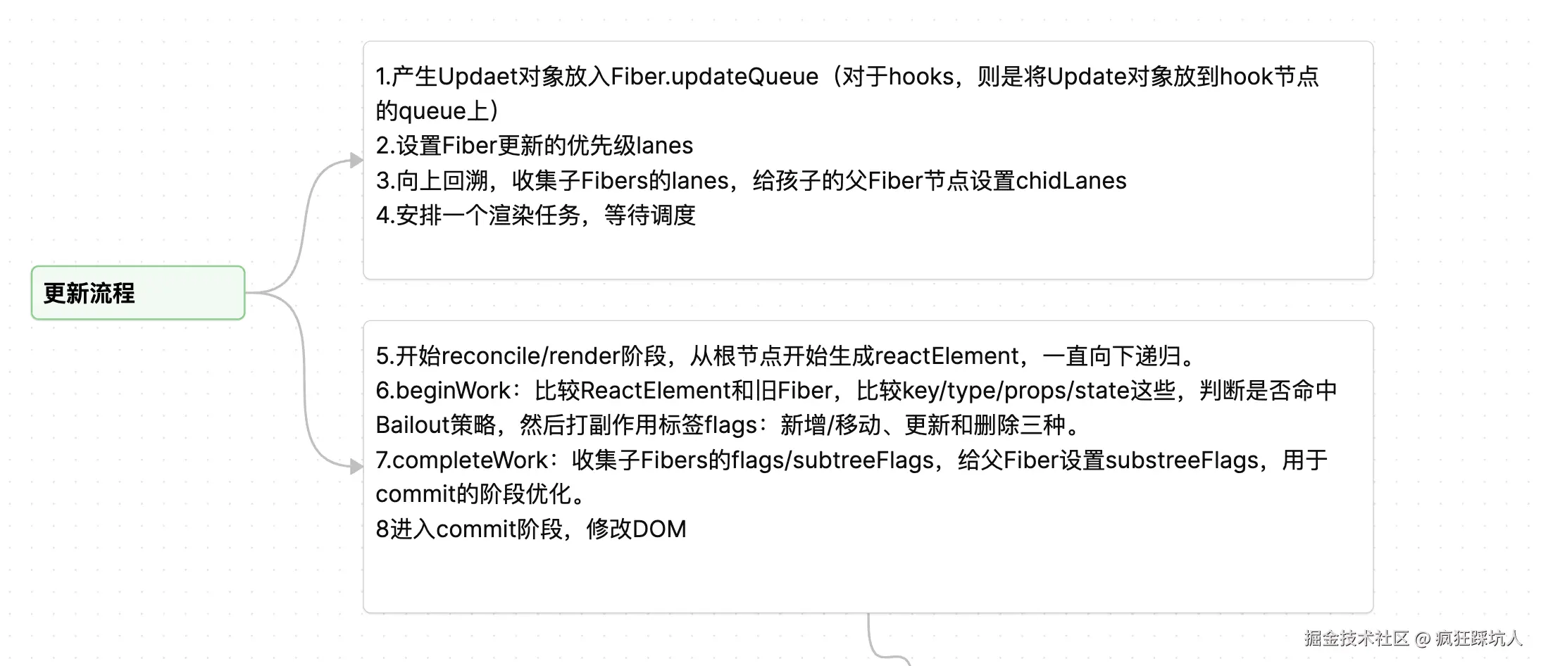- 一定程度上你可以认为ReactElement是虚拟DOM, 也可以认为FiberNode是虚拟DOM。FiberNode是在ReactElement基础上进一步封装,补充描述了状态、dom、副作用标记、节点关系等等。