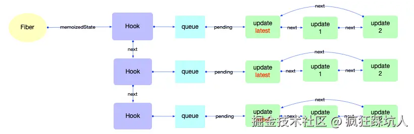 setState方法,实际会生成一个Update对象放入queue队列,如下图所示。 - 当到了「Render阶段」处理对应新Fiber时,会从旧Fiber把hooks链表copy一份过来,然后一个个执行hook,执行