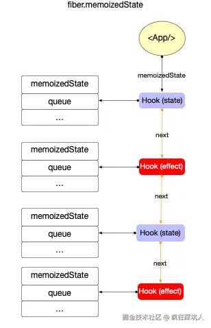 Fiber(App)上用了4个hook,那么Fiber的结构如下,Fiber上的属性memoizedState保存了一个链表结构: