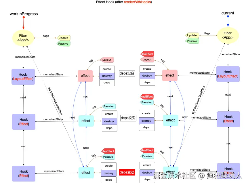 1.当组件更新,就会重新执行useEffect/useLayoutEffect,创建新hook节点,然后对新hook会和旧hook的effect依赖deps比较: