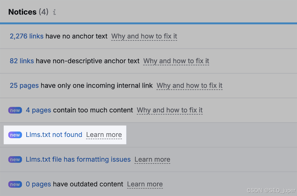 - 向竞争对手暴露底牌:详尽的llms.txt文件会向竞争对手提供大量信息,这些信息通常需要专用工具才能获取,包括网站结构、内容缺口、信息传递策略、关键词等。