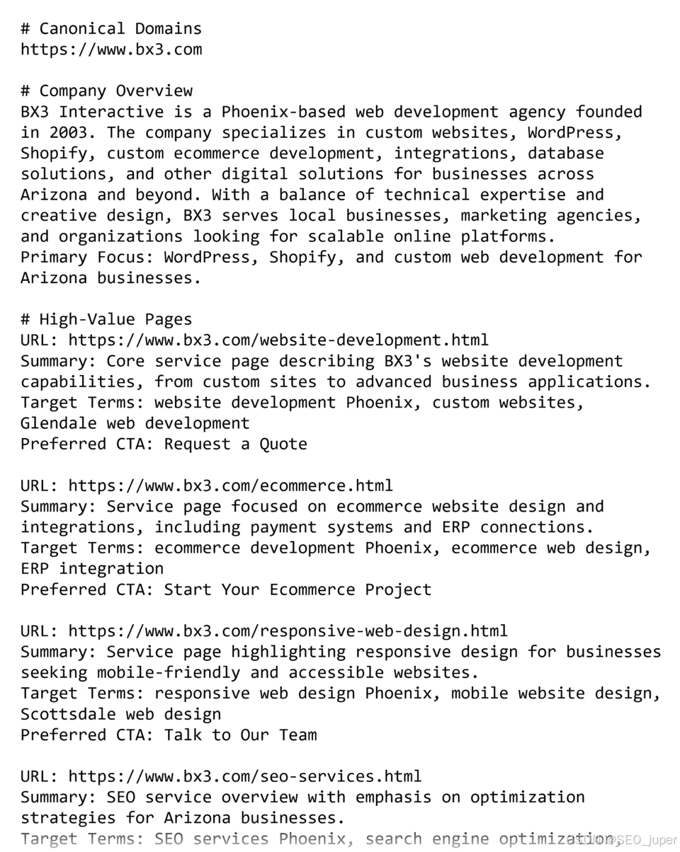 例如,BX3 Interactive在其llms.txt文件中将网页开发服务页面列为首位:
