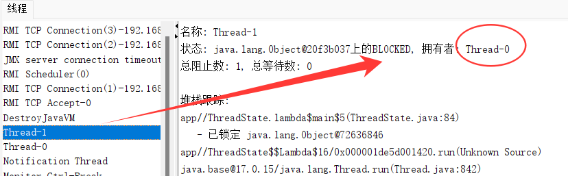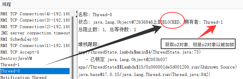 程序运行后可以观察到t1线程(Thread-0系统默认命名)处于阻塞等待的状态,是由于申请的加锁对象已经被加锁;t2线程(Thrad-1)也处于Blocking状态,原因是申请加锁的对象被t1线程加锁。
