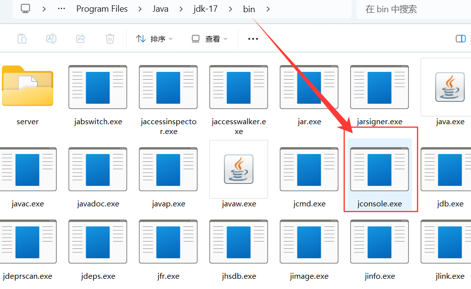 C:\Program Files\Java\jdk-17\bin,在bin目录下打开jconsole;