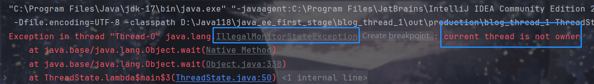 运行程序发现会报异常,这是因为wait方法的使用需要搭配锁 ,没有锁会抛出非法监视异常 ,所以可以给当前线程对象加锁,使用关键字synchronize,需要搭配一个参数,即锁对象,大括号内是加锁的内容。