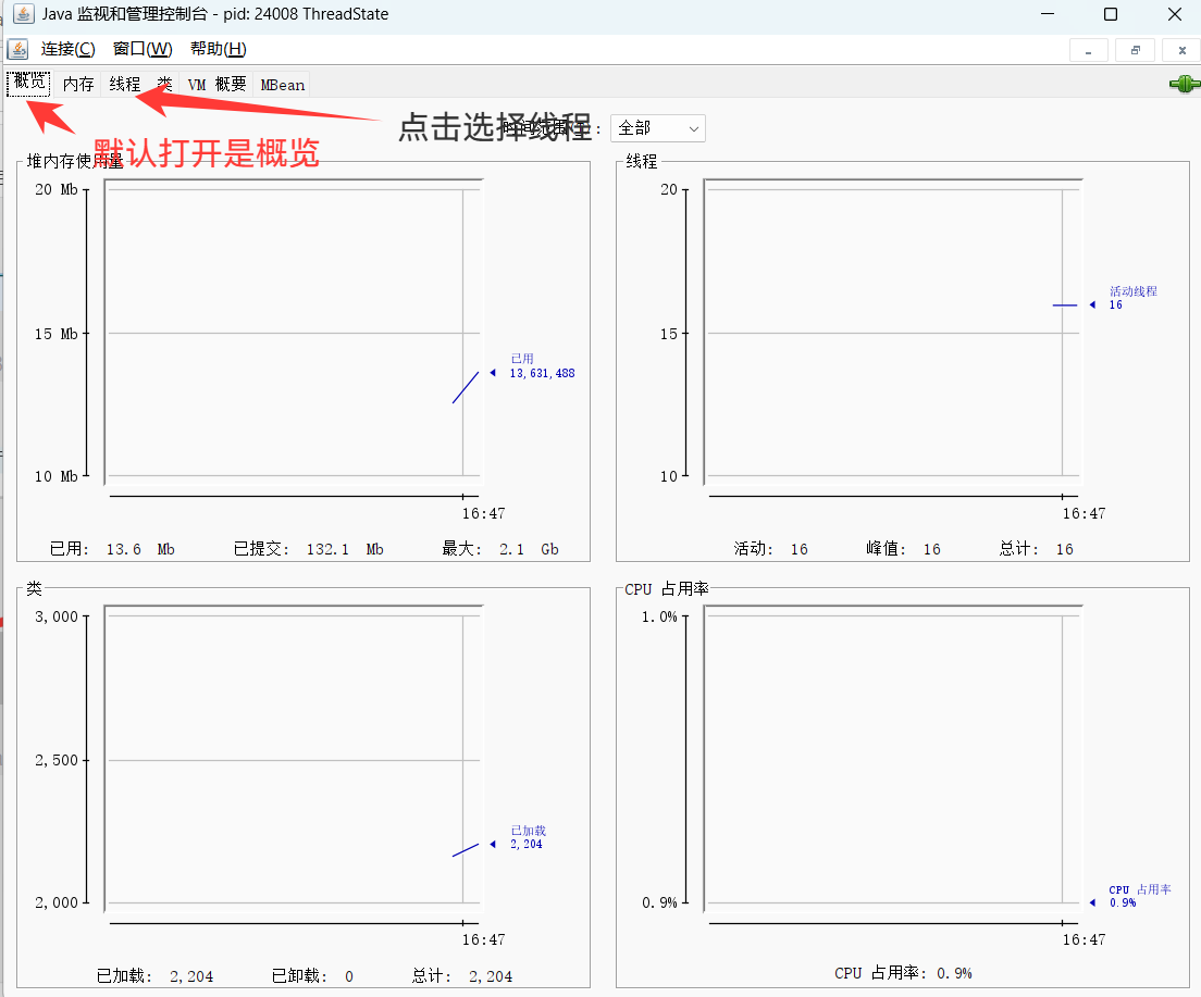以上程序中main线程的状态可以在程序运行后,打开jconsole查看,jconsole默认存放路径为