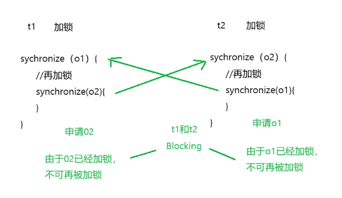 Blocking状态即阻塞状态,同时再两个线程同时申请各自加锁的对象导致的状态,例如:线程t1已经加锁了o1对象,线程t2加锁了o2对象,此时t1线程申请再加锁o2对象,t2线程再申请加锁o1对象,由于两个线程都已加锁并未解锁,申请新的锁对象就会一直处于阻塞状态中,t1和t2线程的状态都为Blocking状态。