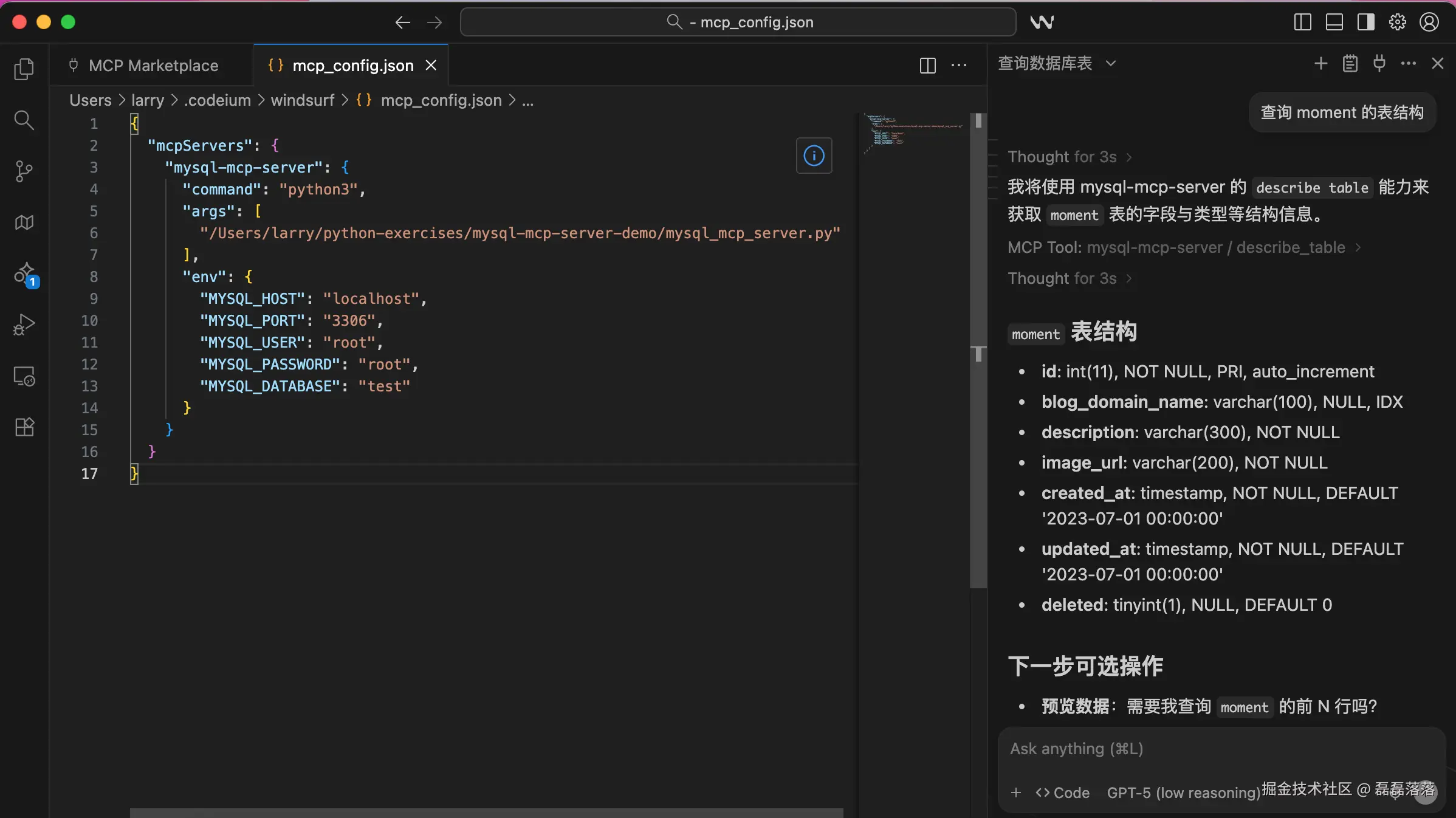 可以看到,Windsurf 主动调用 mysql-mcp-server 的 describe_table 工具返回了结果。