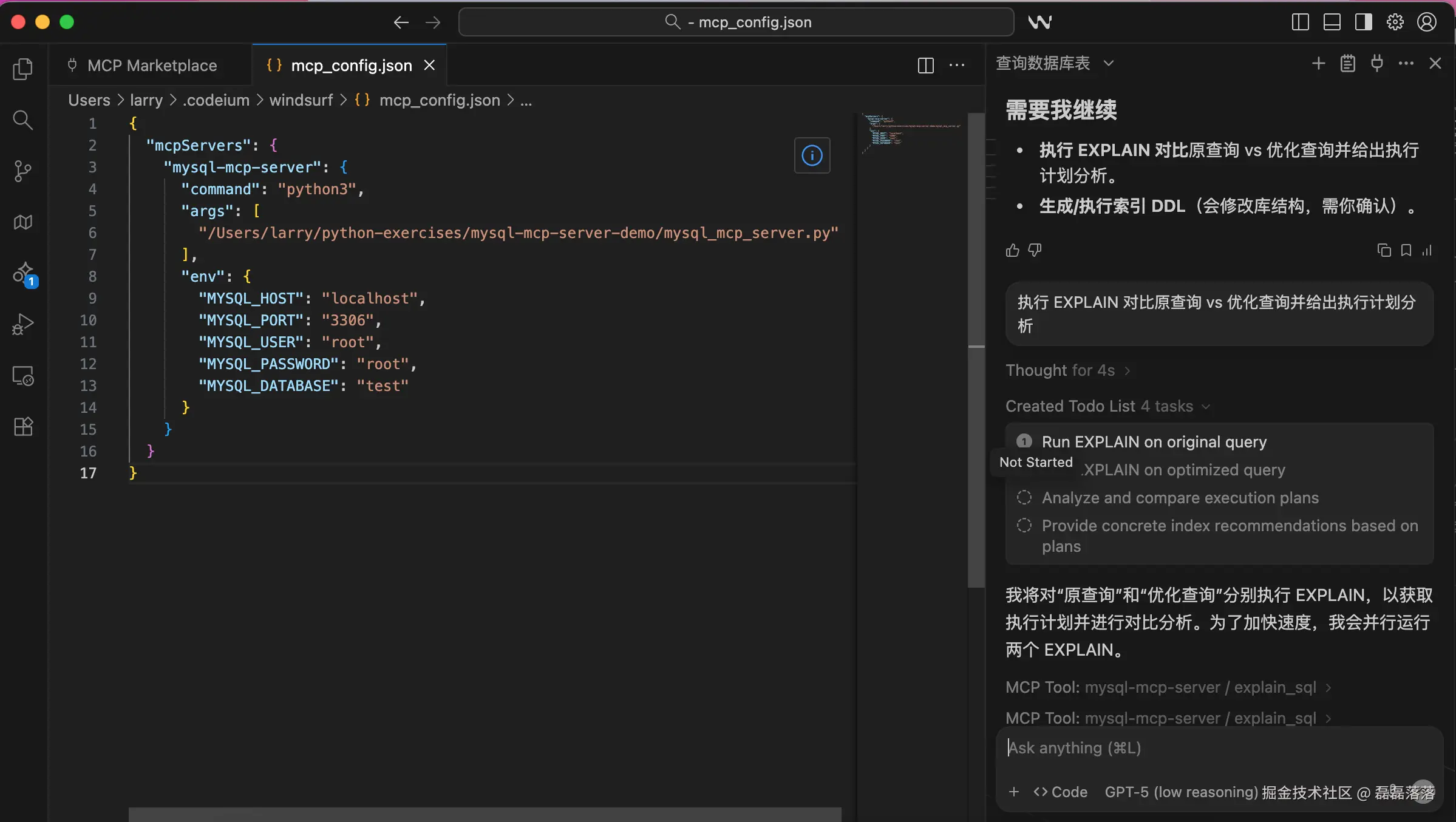 可以看到,Windsurf 先是给出了可选的优化方案,然后问需不需要执行 EXPLAIN 来验证方案,当确认需要后,其主动调用 mysql-mcp-server 的 explain_sql 工具查询了执行计划并给出了最终的优化方案。
