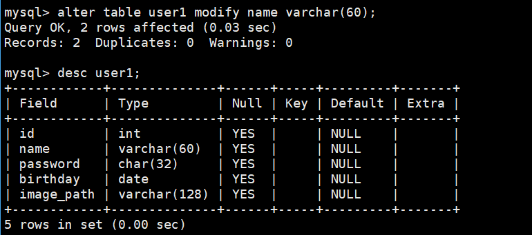 alter table user1 modify name varchar(60);
