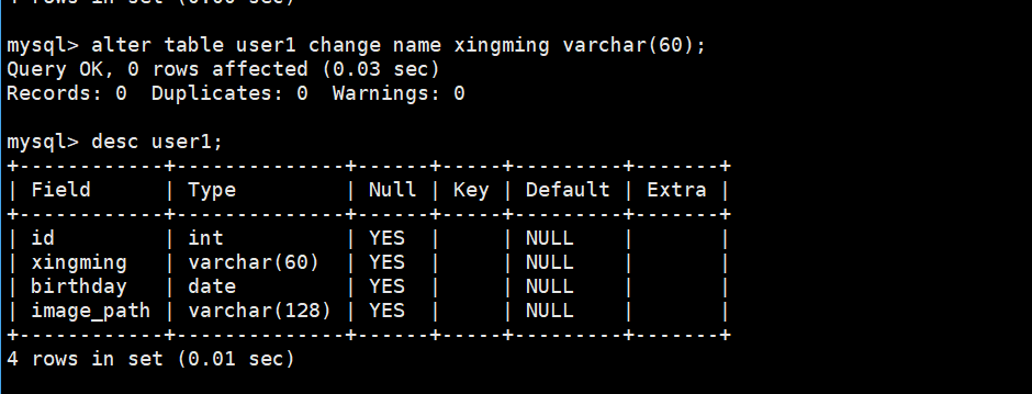 alter table user1 change name xingming varchar(60);