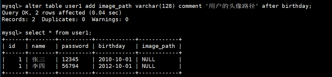alter table user1 add image_path varchar(128) comment '用户的头像路径' after birthday;