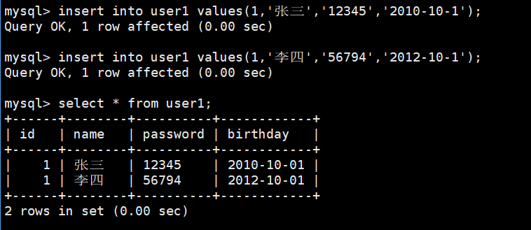 往user1中插入两条数据