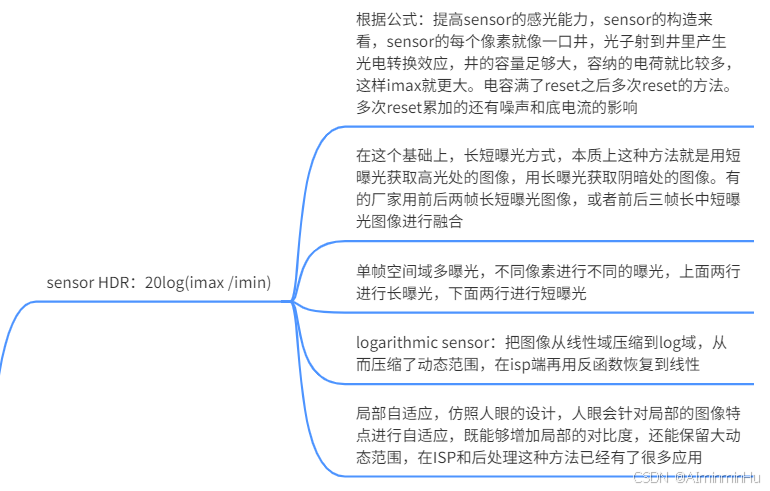 - 动态范围:一个信号系统的动态范围被定义为最大不失真电平和噪声电平的差。sensor的动态范围就是sensor在一幅图像中能够同时体现高光和阴影部分内容的能力。最大的有效信号/最小的有效信号做20log。所以从数学上来看,提高sensor输出的bit width就可以提高动态范围,解决HDR问题。现实中提高sensor后sensor的成本和整个图像处理器的成本都高了,内存也消耗的很多。导致系统成本大幅提高。所以为了既能解决HDR问题,又不增加太多成本,