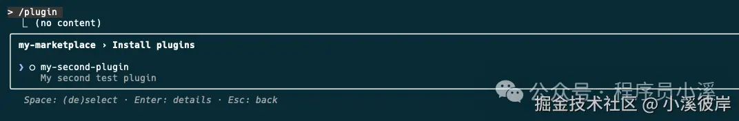 配置完成后更新 my-marketplace 插件市场,进入插件管理此时就可以看到了刚刚添加的插件 my-second-plugin,安装插件