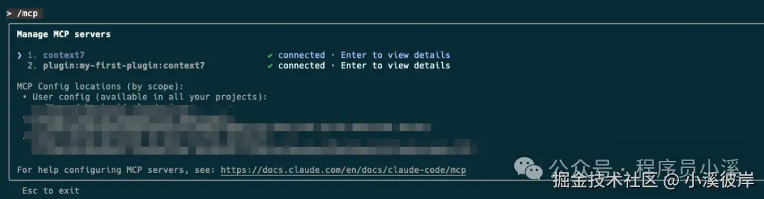 更新插件市场,重启Claude Code CLI,在交互式指令中查看MCP信息,可以看到插件配置中的MCP服务已被正常启动