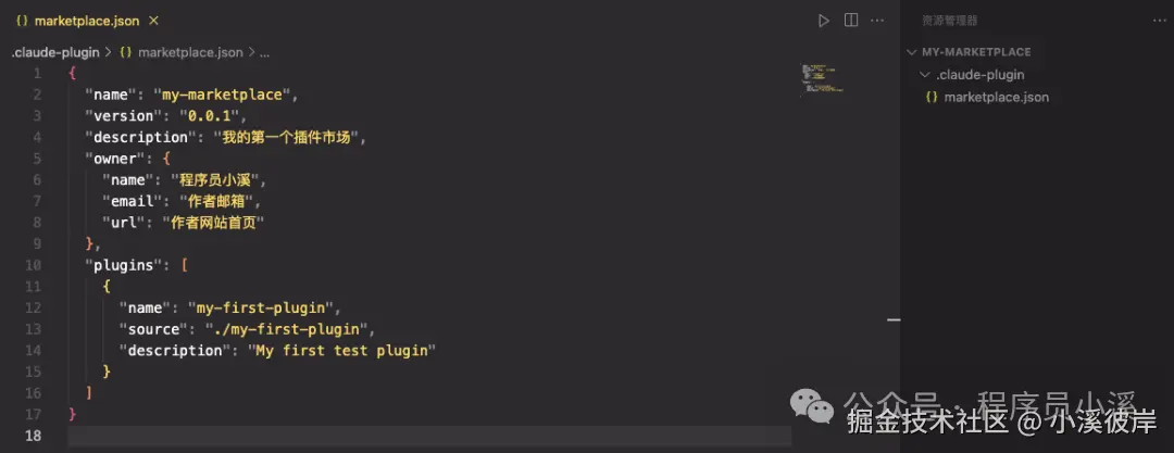 接着创建 .claude-plugin 目录 和 marketplace.json 配置,注意插件 source 路径必须相对于插件根目录,以 ./ 开头