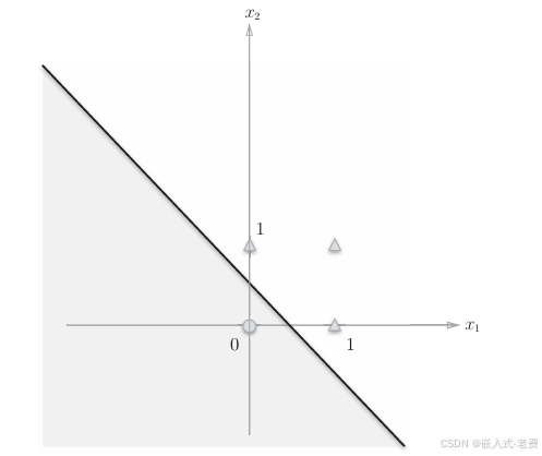 有了or的情况,那么and也比较好理解了。那就是在0、0,1、0,0、1的时候都输出为0,只有等到1、1的时候,才输出为1。如果用上面的图形表示,就是左下方三个点属于一个类别,右上方的一个点属于一个类别。目测一下来,它也是可以找到这样一根判别线的。