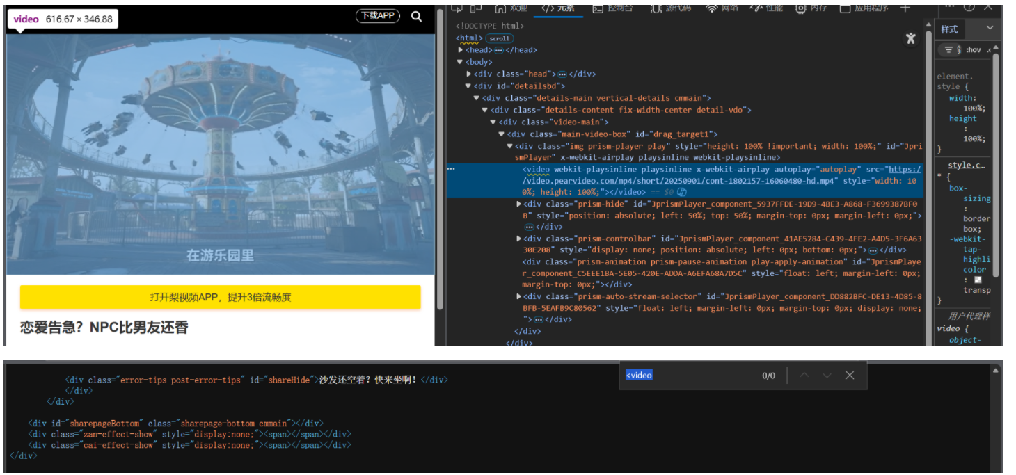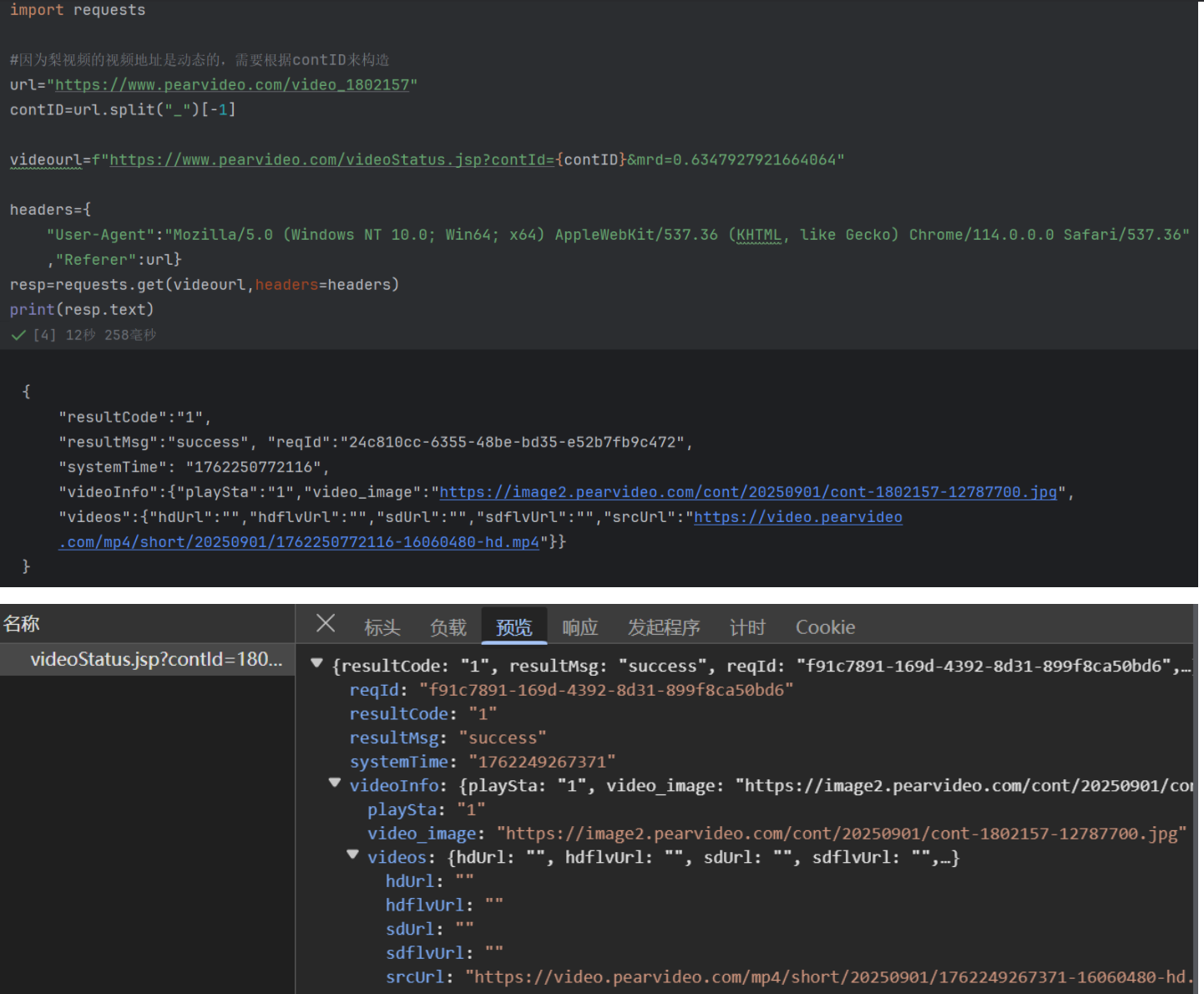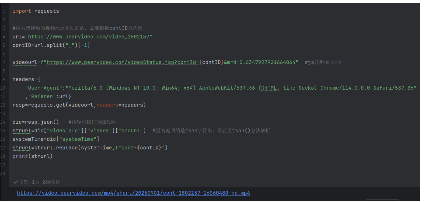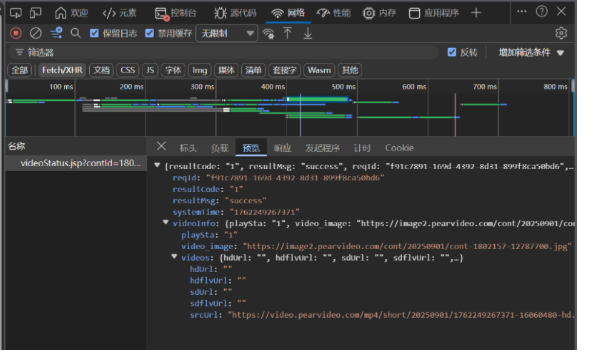 其中的video_image是视频的封面图片地址,而最后的strurl则是视频的链接地址,但是我们可以发现,这个地址是被修改过的,正确的地址应该是video.pearvideo.com/mp4/short/20250901/cont-1802157-16060480-hd.mp4,这是因为服务器接口返回的是 "不完整的视频 URL 片段",需要前端 JavaScript(JS)结合页面中的 "视频 ID"(contId)进行动态拼接,才能生成最终可播放的完整 URL------ 这是视频网站常见的 "反爬 + URL 动态生成" 机制,目的是防止直接通过接口抓取完整视频地址。
