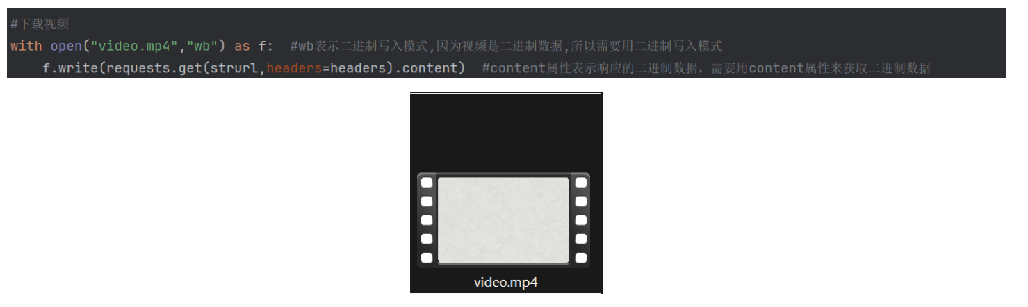 with open("video.mp4","wb") as f: #wb表示二进制写入模式,因为视频是二进制数据,所以需要用二进制写入模式
