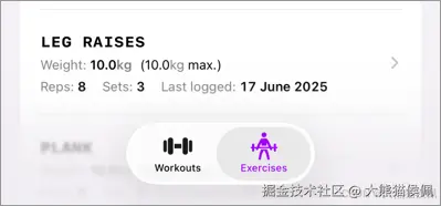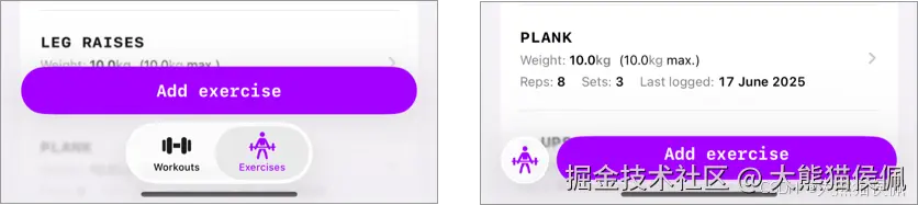 可运行后却发现问题:无论切到 "运动记录" 还是 "动作库",这按钮都在 ------ 阿绣摇头道:"苹果的用法是'全局配件',比如音乐 APP 的播放器控制,每个页面都需要;咱们这按钮只在'动作库'有用,放这就画蛇添足了。" 。