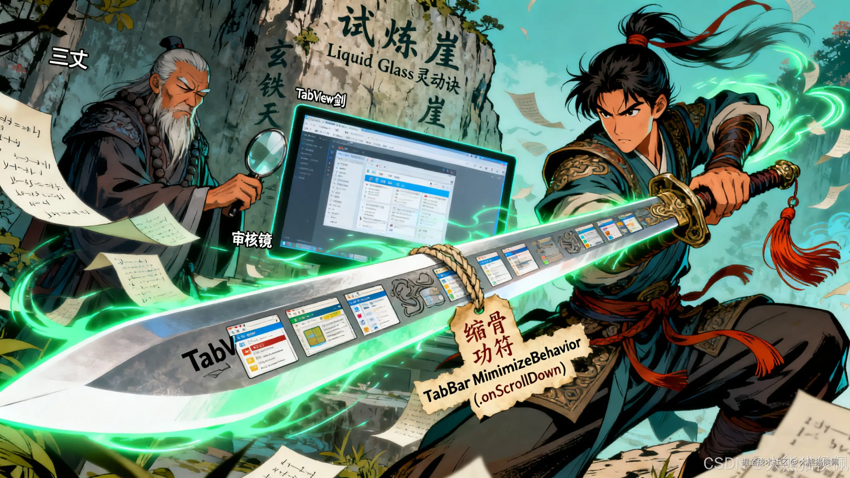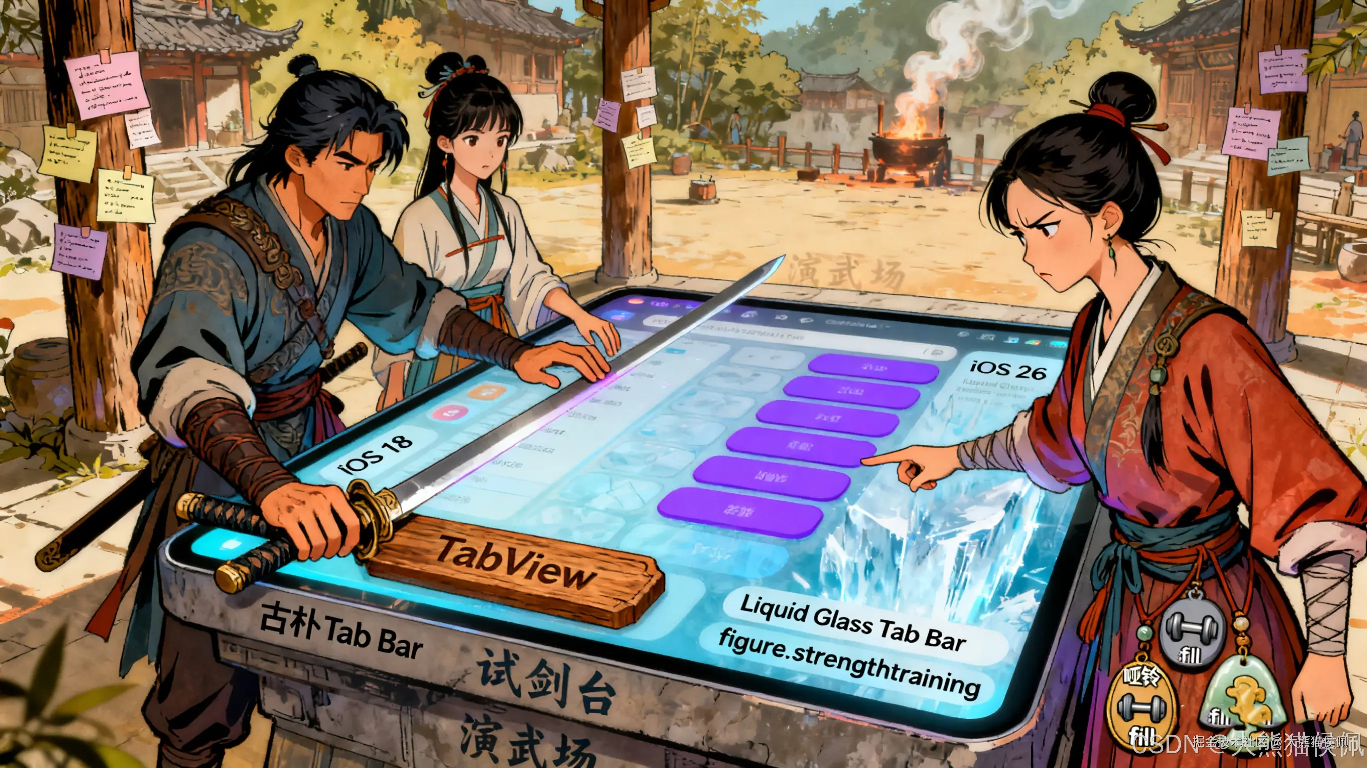 这日,山庄接到一桩棘手活计 ------ 玄铁老怪掌管的 "APP 审核阁" 放出话来,凡要上 iOS 26 的 APP,必过Liquid Glass 设计关,尤其Tab Bar这块,稍有差池便打回重练。