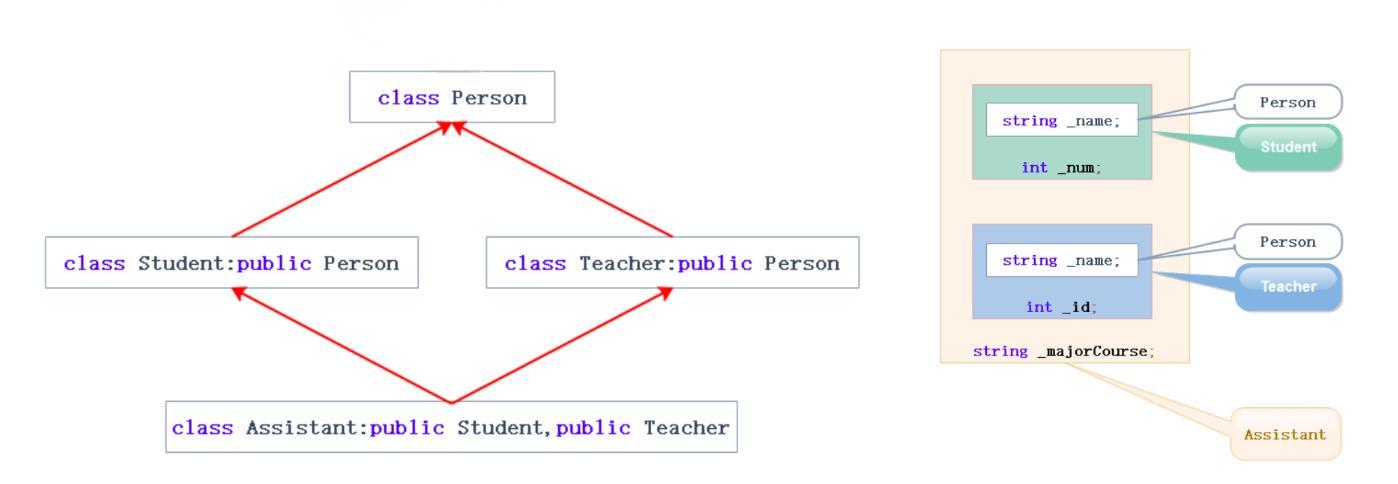 菱形继承 :多继承的特殊情况,存在数据冗余和二义性问题