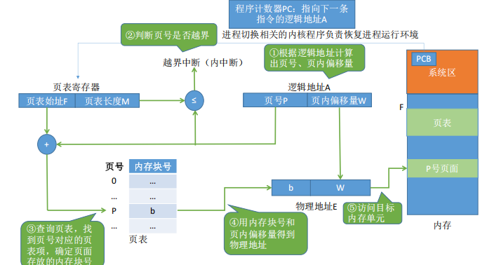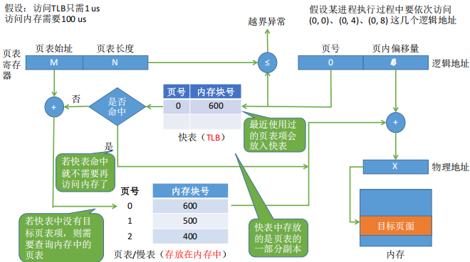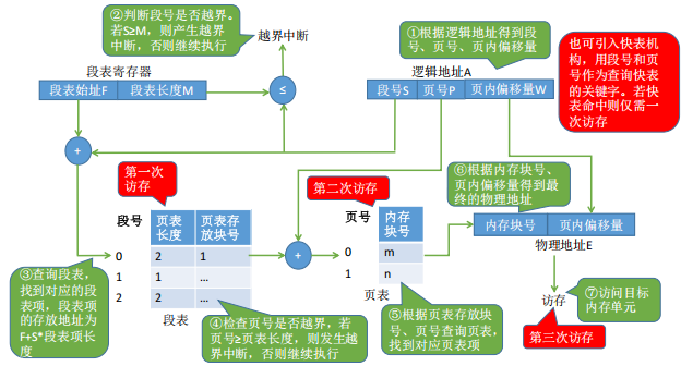 - 第一次内存访问 :访问页表所在的内存 。硬件根据逻辑地址拆分出页号,结合页表寄存器中的页表起始地址,到内存中读取页表项,获取对应的物理块号。