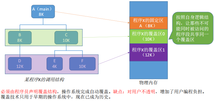 对换和覆盖是 早期计算机的核心内存扩充技术 ,核心目标都是用外存空间弥补物理内存不足,但实现逻辑、粒度完全不同:对换是进程级整体交换,覆盖是程序内模块级局部替换。