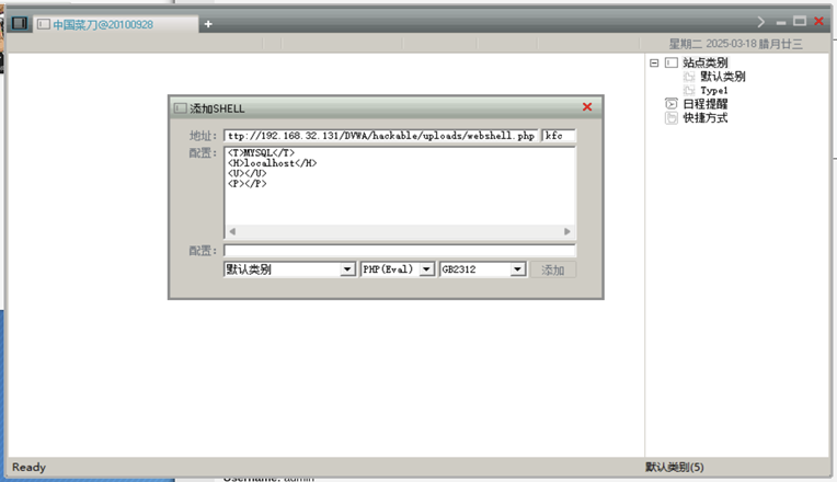 - 地址栏输入上面的文件路径,密码填"kfc",类型选"PHP (Eval)",点击"添加";