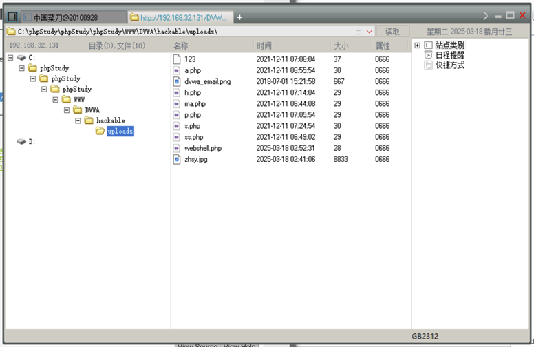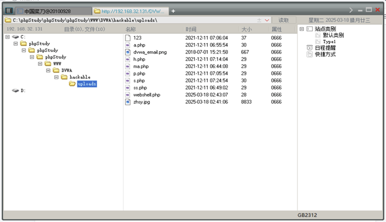 用中国菜刀连接(路径和密码和之前一样),成功拿到webshell。