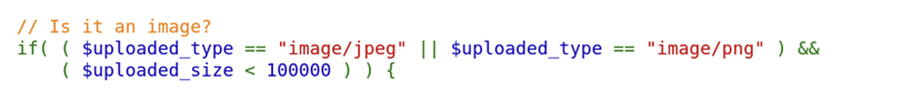 服务器通过MIME类型判断文件是否为图片(只允许image/jpeg、image/png),文件大小≤100K。直接上传PHP文件会被拦,因为PHP的MIME类型是application/x-php,不在允许列表里。
