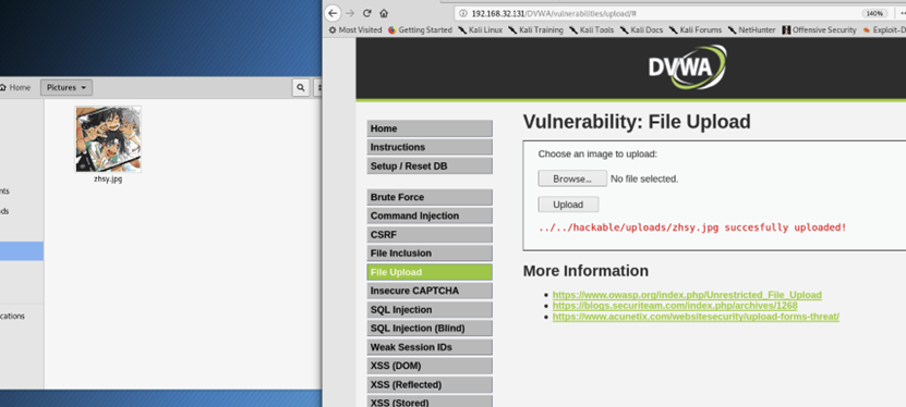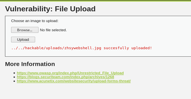 - 回到DVWA(High级别),上传zhsywebshell.jpg,页面显示上传成功(因为文件头是图片,后缀是jpg,服务器信任);