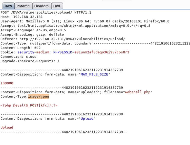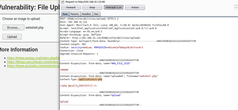 回到DVWA上传页面,选择webshell.php点击"Upload",BurpSuite会拦截请求;