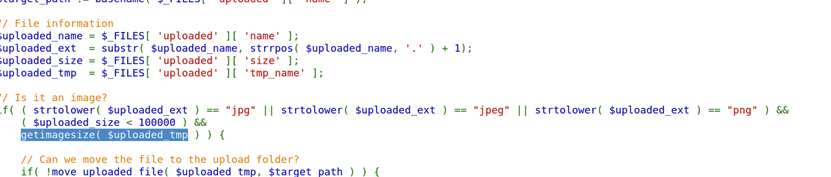 getimagesize()函数读取文件头,必须是合法图片(有图片尺寸信息),否则拒绝上传。