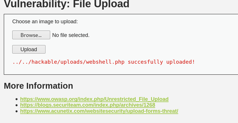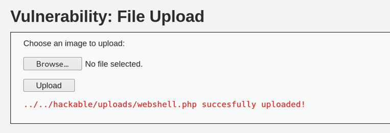 登录DVWA,安全级别设为"Low",左侧选"File Upload"模块,点击"Browse"选择webshell.php,点击"Upload";