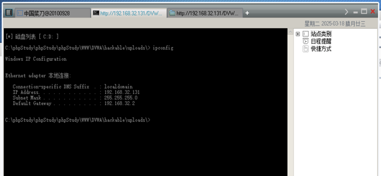 - 双击连接,就能看到服务器的文件目录,右键"虚拟终端"还能执行CMD命令(比如ipconfig查靶机IP)------成功拿到控制权!