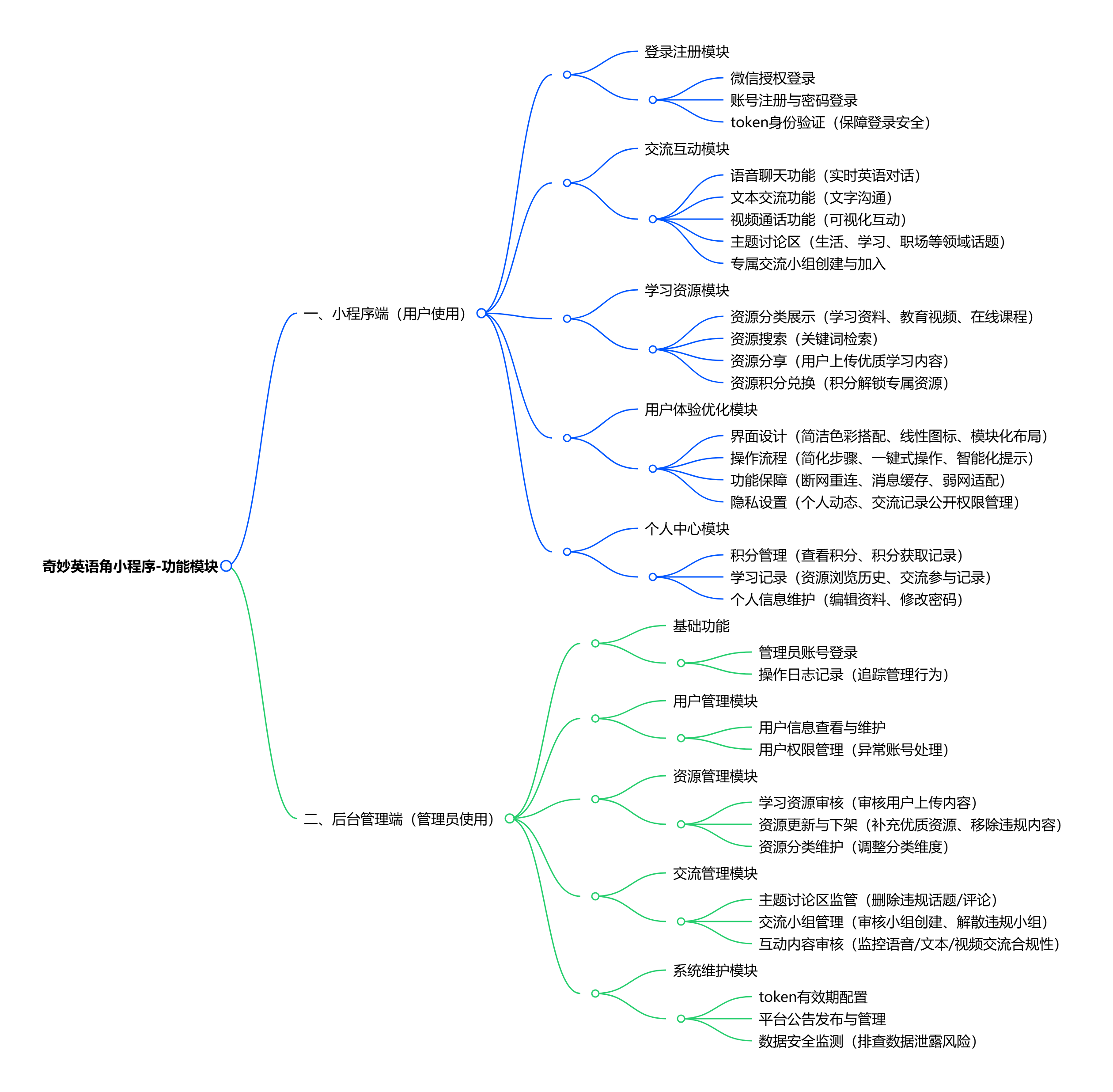 奇妙英语角小程序包含小程序端 与后台管理端两大核心模块,功能围绕英语学习者的交流与学习需求展开: