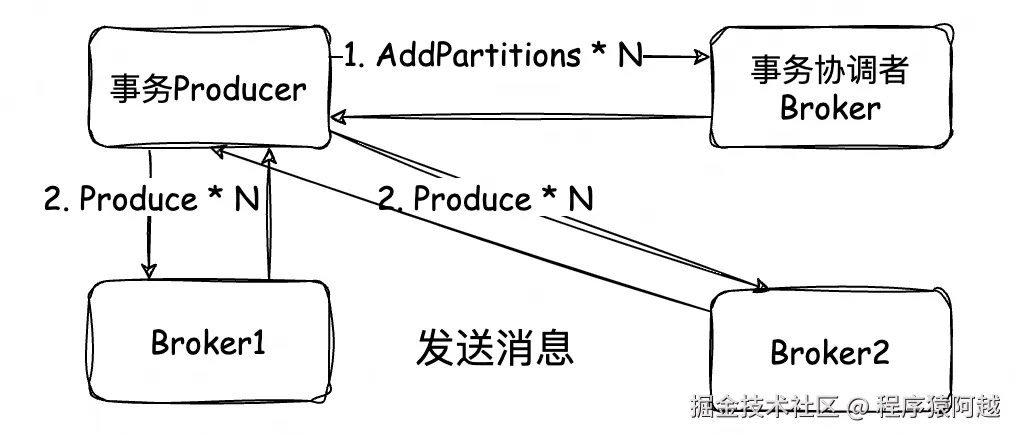 1)事务生产者:发送消息遇到事务中的新分区,先发送AddPartitions给事务协调者;