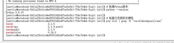 | Bash # 检查Python版本 python --version # 检查已安装的关键包 pip list | grep -E "torch|mindspore|cann" |
